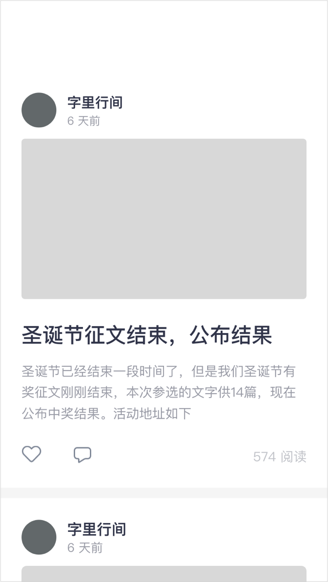字里行间在首页的板块设计比较松散,虽然也重复运用了间距,但是没有节奏。图片比例也比较奇怪,多行段落文字显得比较松散。